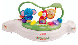Everything your baby needs at play-time can be found in this Rainforest Jumperoo. Its newly designed frame both allows you to open it up from the top, and lets the seat rotate 360 degrees so baby can play and interact from any side. A fun seat and toys at five locations on the platform engage baby all the way around, and an electronic toy at the front has motion, music and lights that can be activated by baby spinning a drum. (Mom or Dad can also activate an option for four minutes of continuous play.)